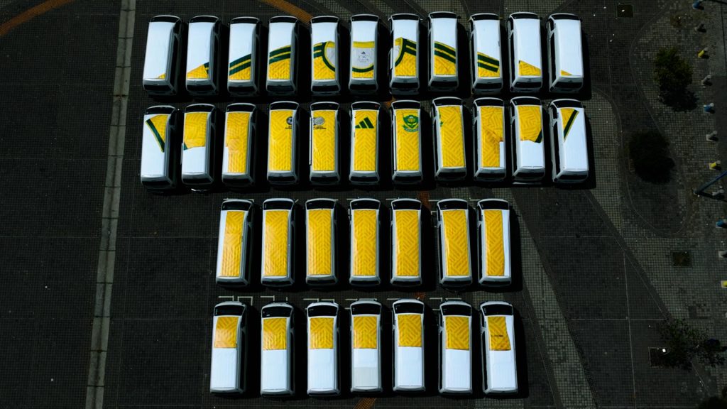 Nearly 40 taxis, precisely aligned, form the shape of the new Bafana Bafana jersey. Not just revealed, but built by the people who carry the nation forward every day. It is a statement of unity, pride, and belonging. A reminder that football in South Africa lives far beyond the pitch, it lives in our streets, our stories, and our shared identity.